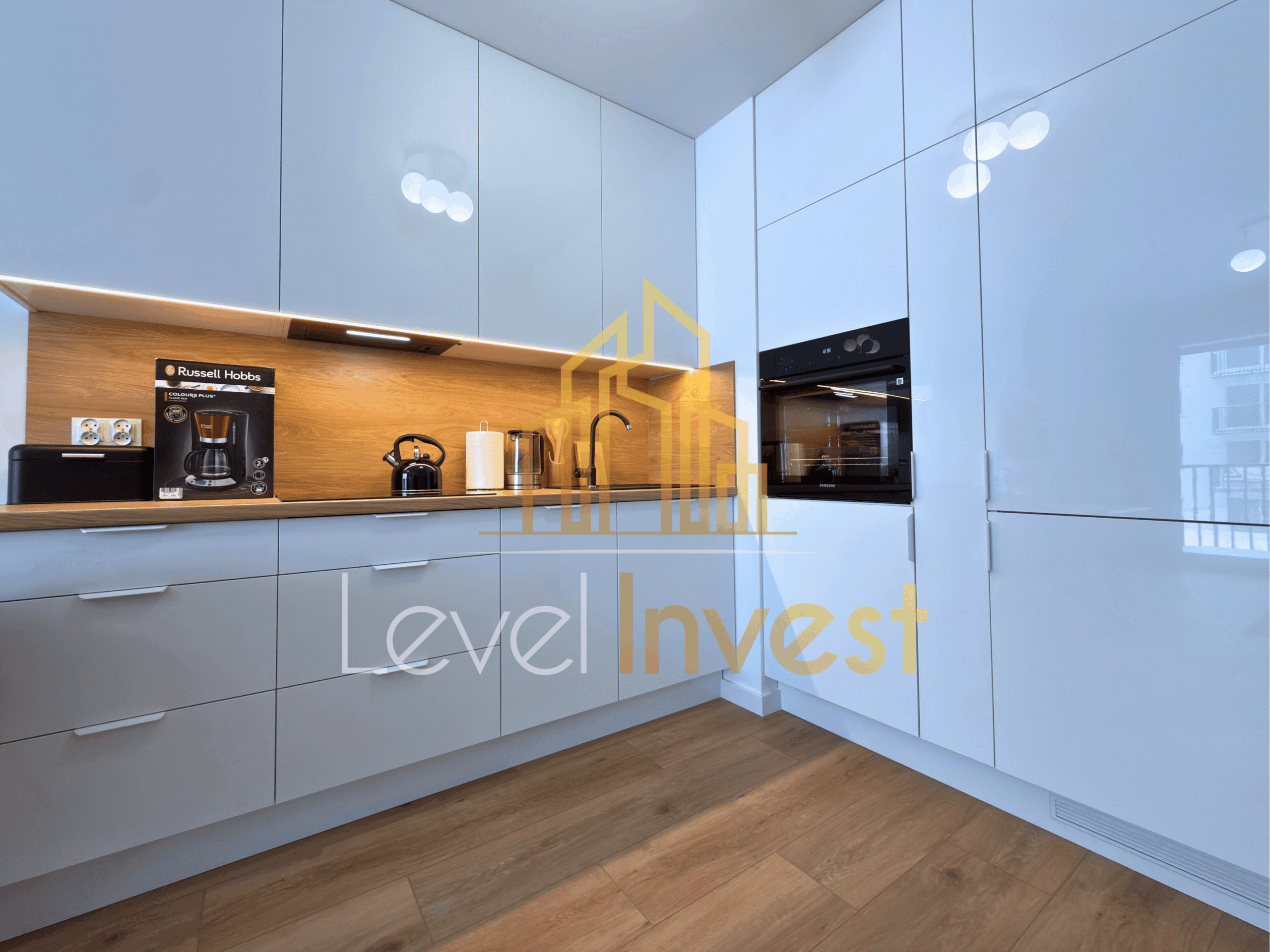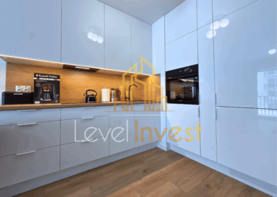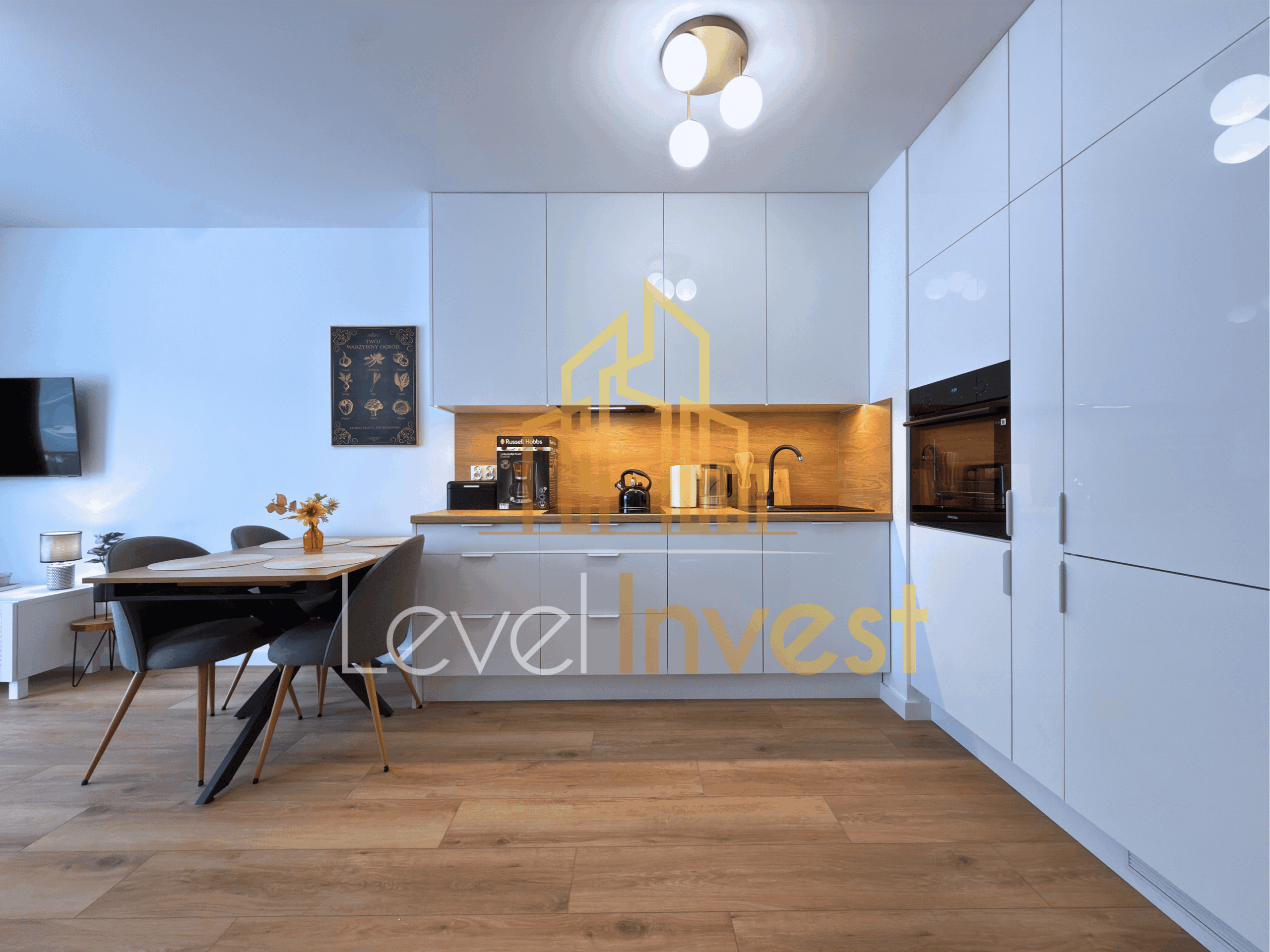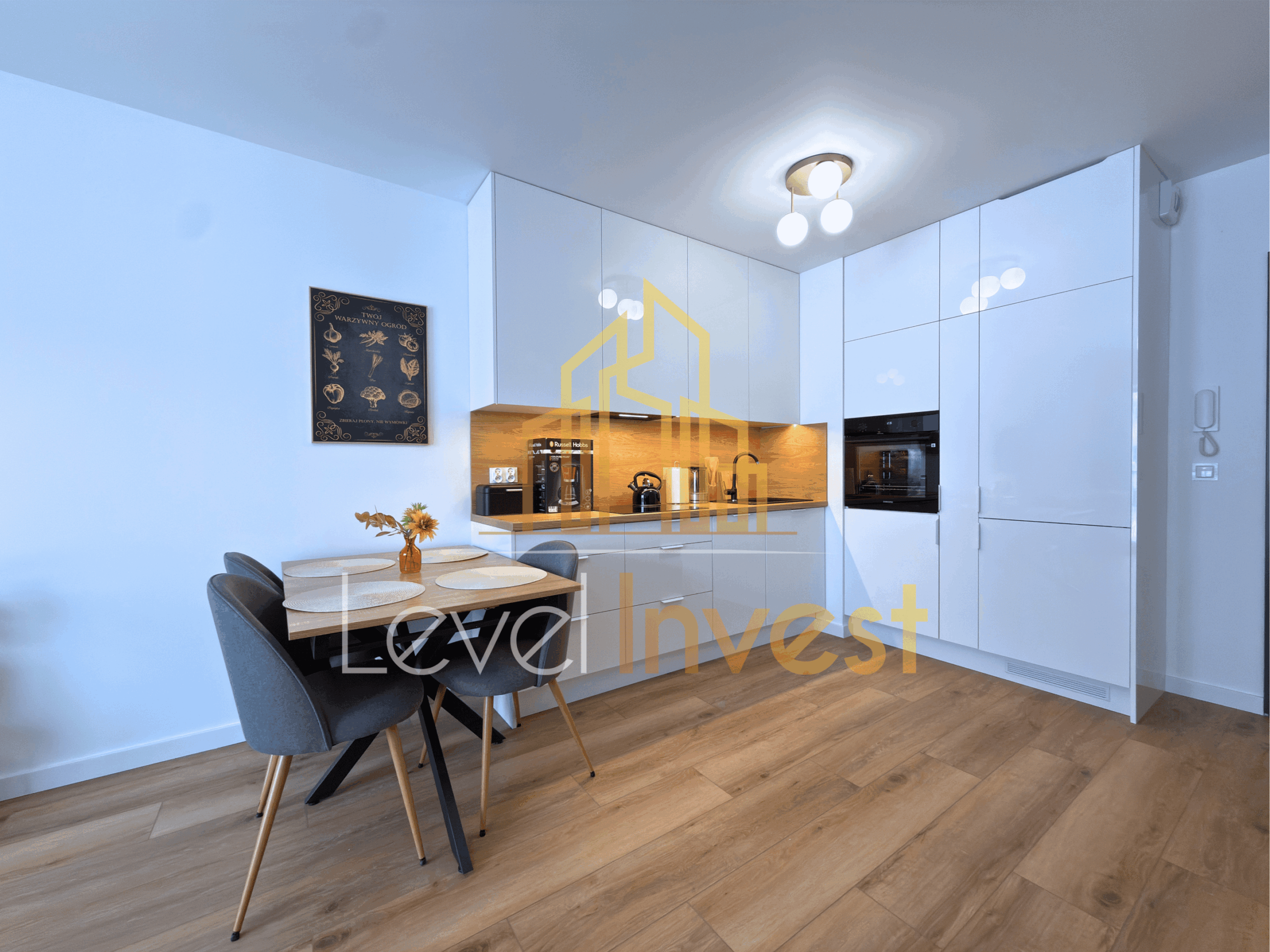 Apartament jest kompletnie umeblowany i wyposażony. Nowoczesna kuchnia z zabudową na wymiar została wyposażona w sprzęt AGD, w tym: