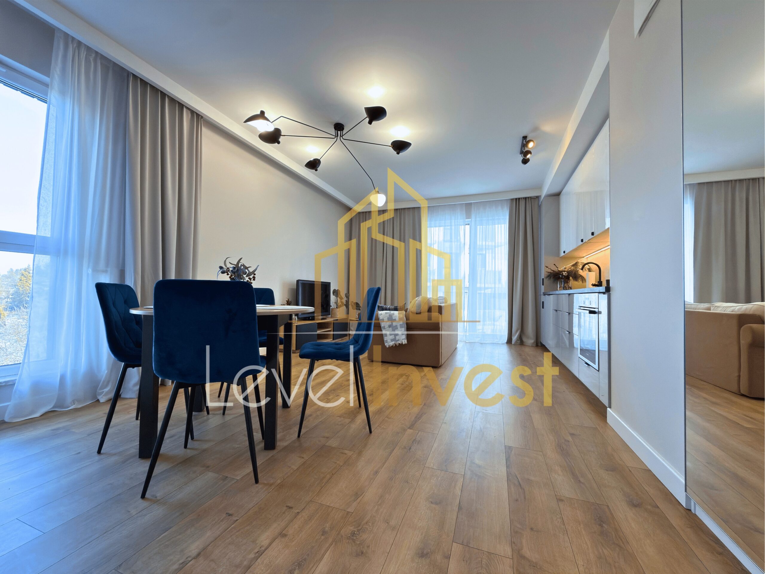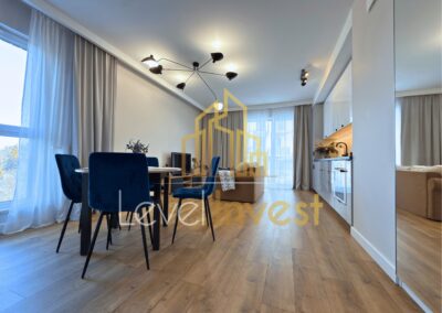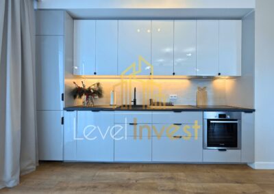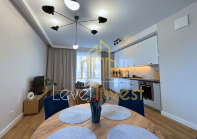 Mieszkanie jest w pełni umeblowane i wyposażone, wykończone w wysokim standardzie, z dbałością o detale oraz jakość użytych materiałów. W salonie znajduje się telewizor, a kuchnia wyposażona została w nowoczesne sprzęty AGD, w tym lodówkę oraz zmywarkę. W łazience do dyspozycji najemcy pozostaje pralka. Całość tworzy spójną, estetyczną i funkcjonalną przestrzeń, idealną do komfortowego życia.