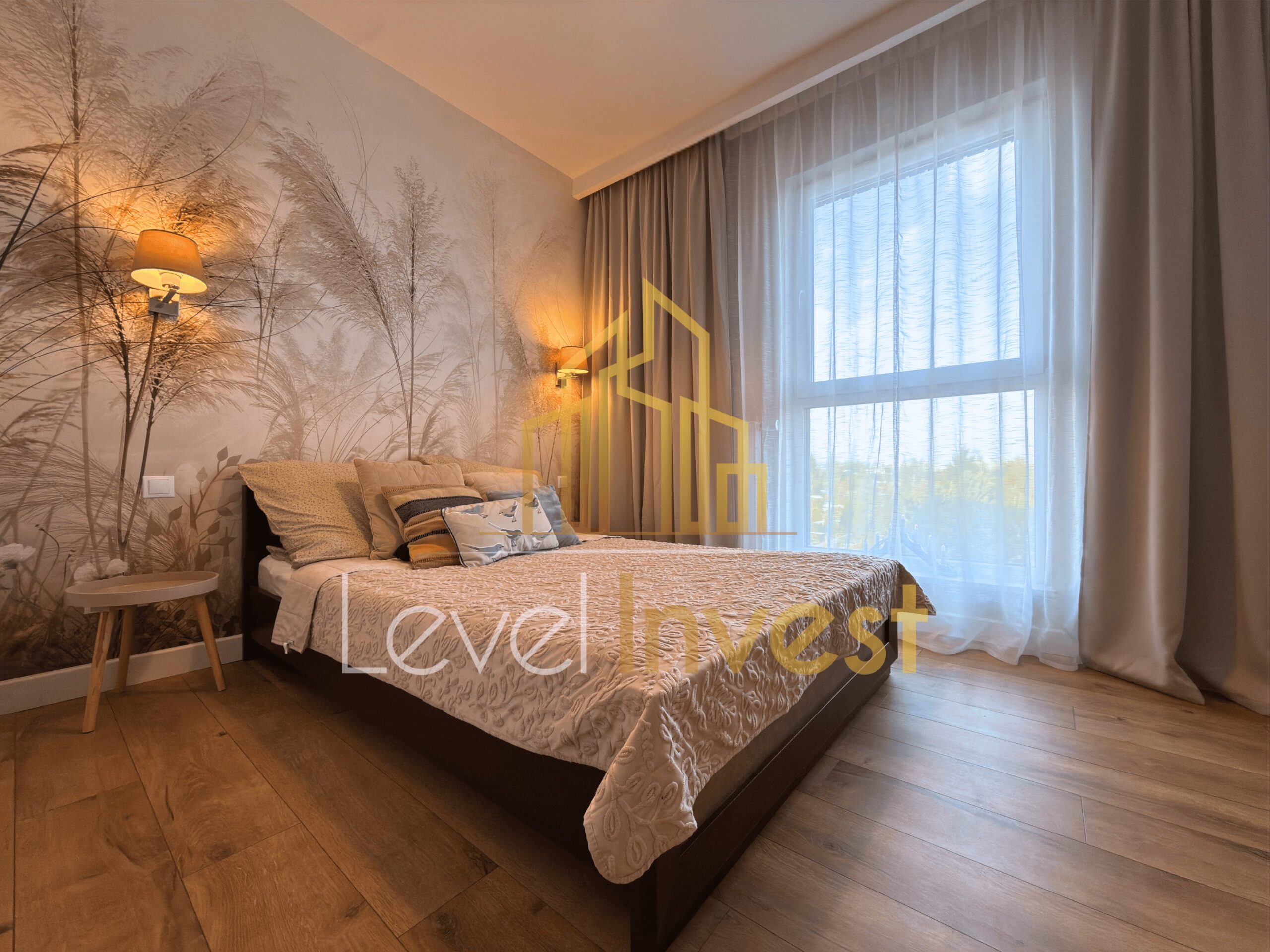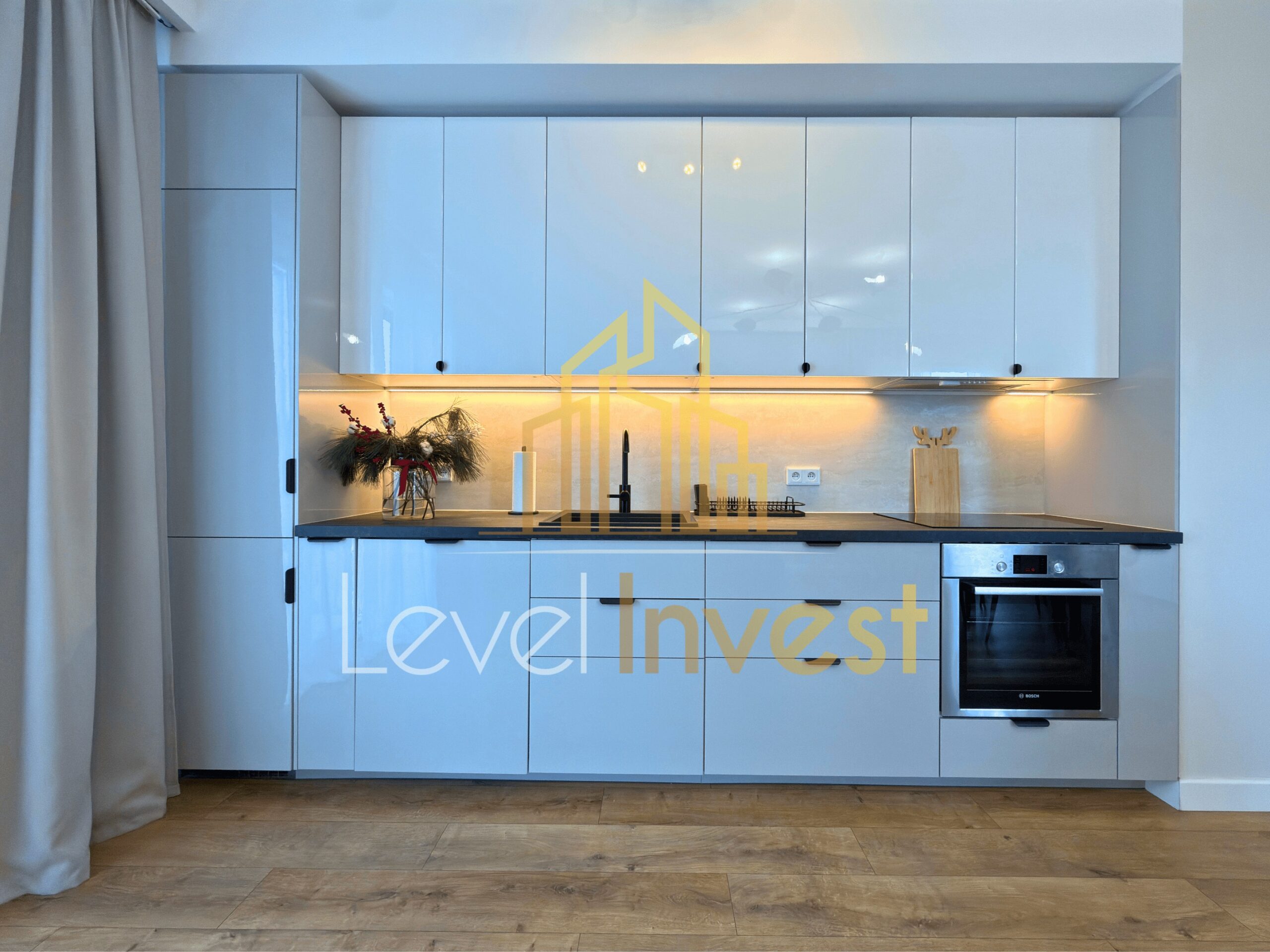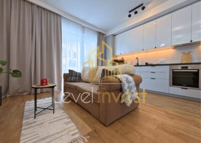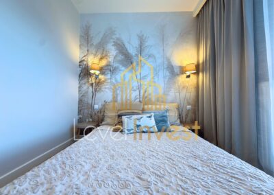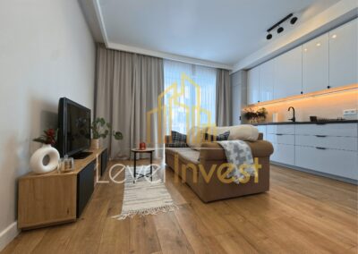 The apartment is fully furnished and equipped, finished to a high standard with attention to detail and quality materials. The living room features a TV, while the kitchen is fitted with modern household appliances, including a refrigerator and a dishwasher. A washing machine is available in the bathroom. The interior forms a coherent, aesthetic, and functional space, ideal for comfortable living.