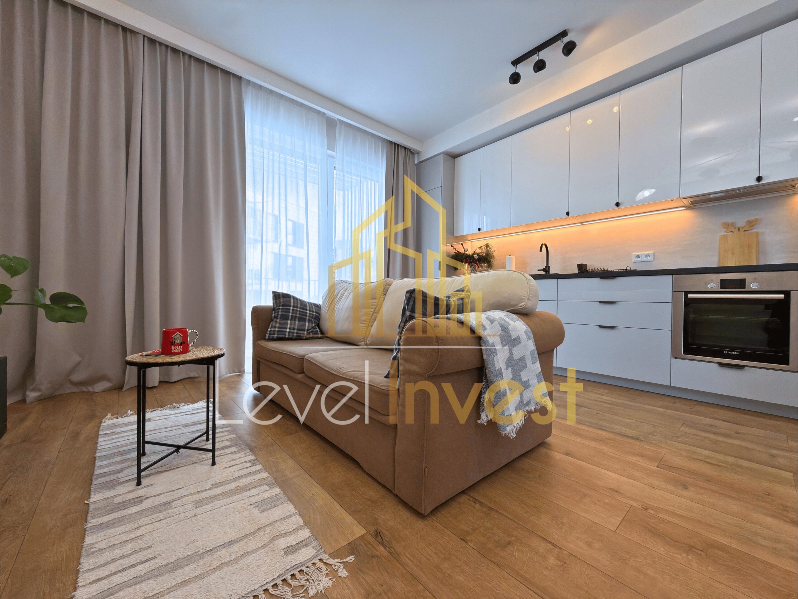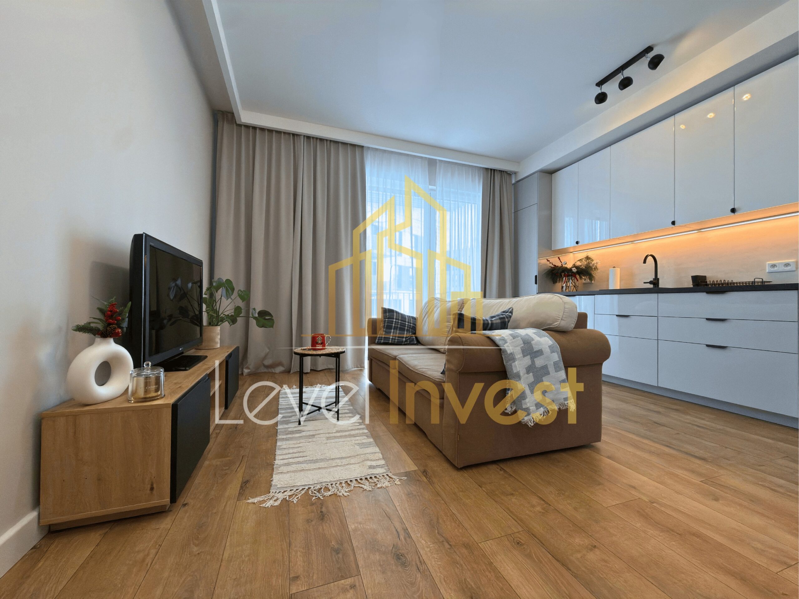 - a spacious living room with a kitchenette, forming the heart of the apartment,
