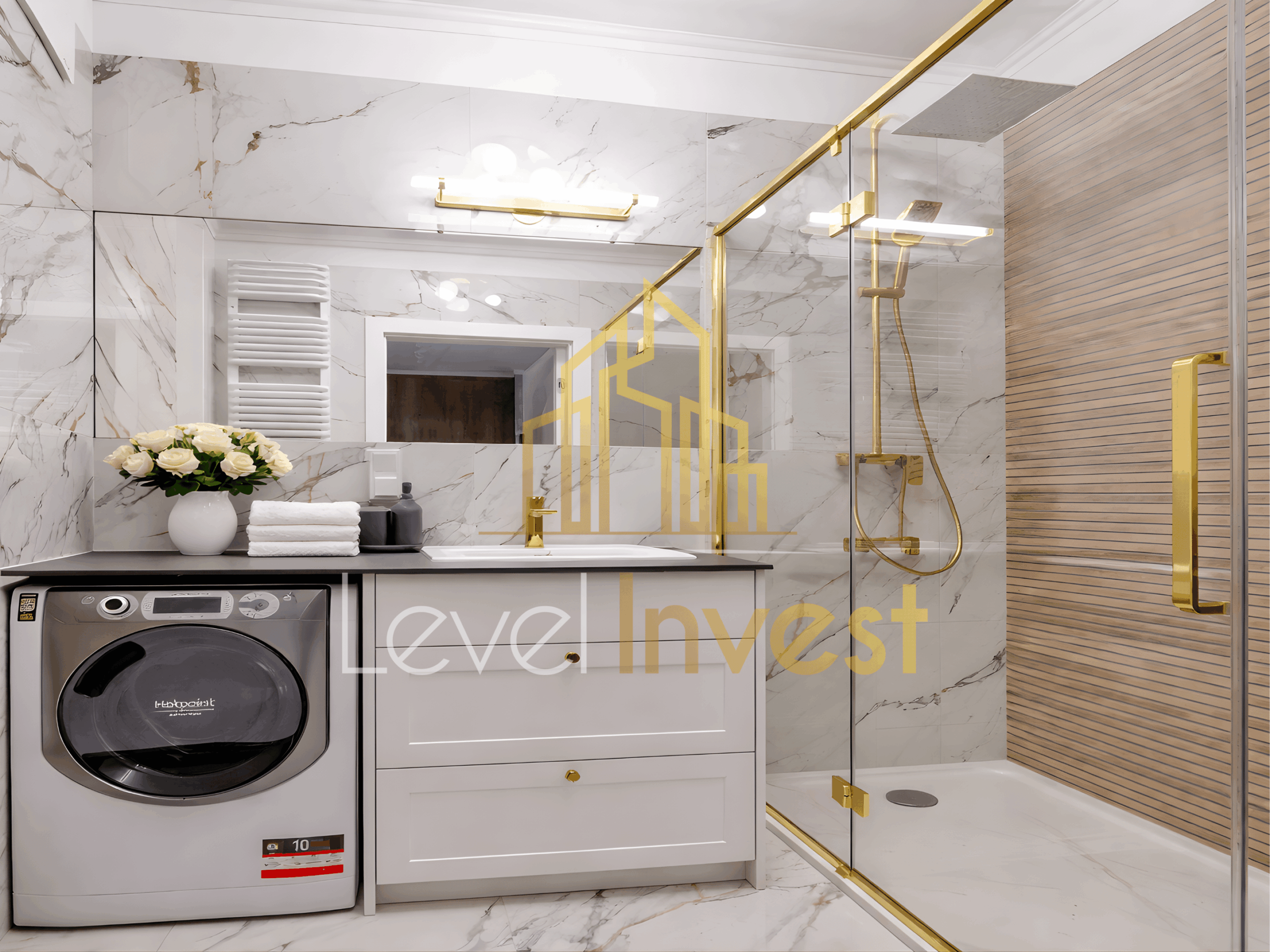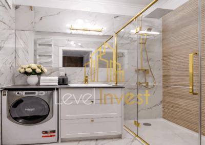- Łazienka – standard premium, prysznic typu walk-in, pralka, wysokiej jakości armatura