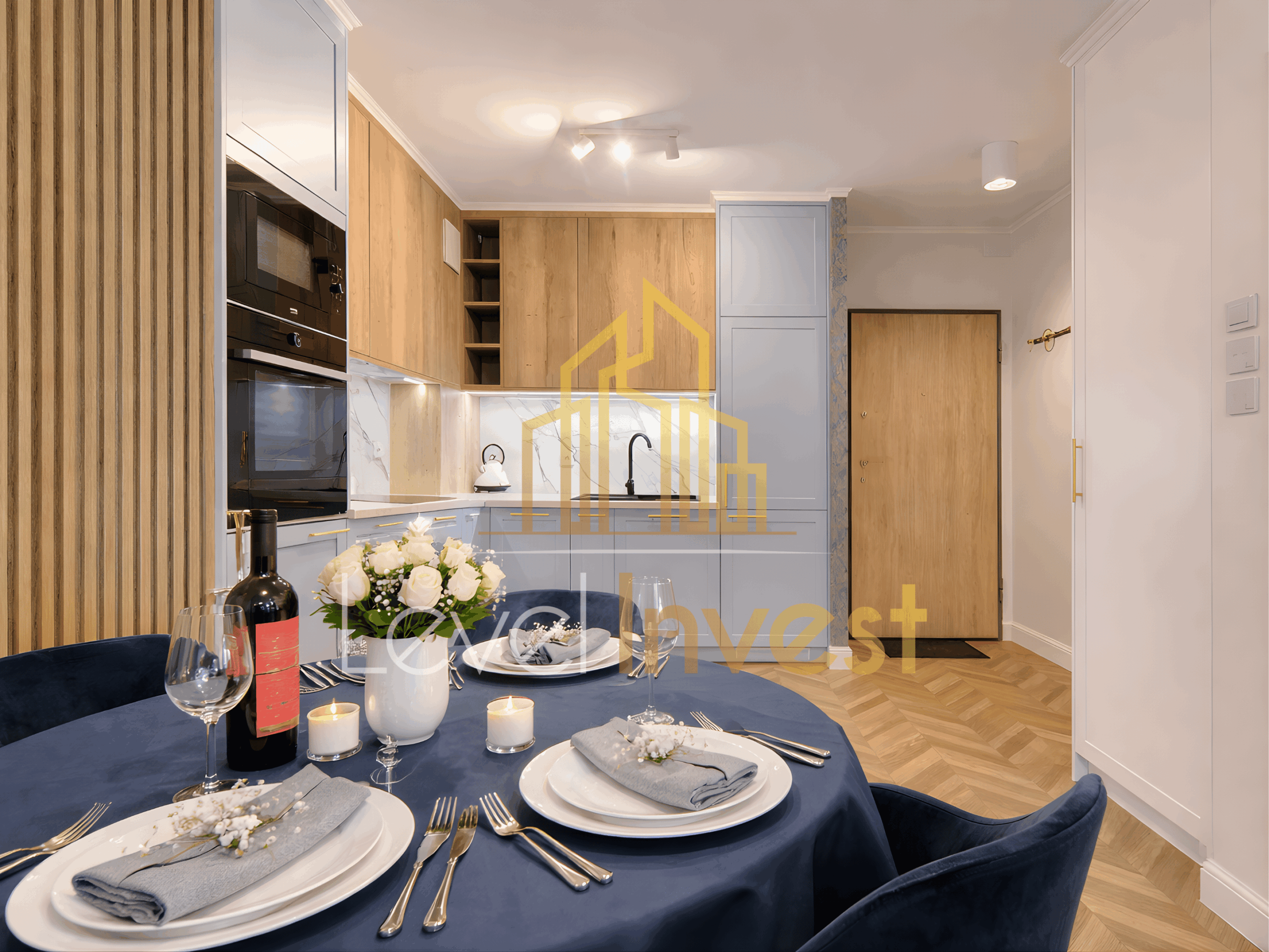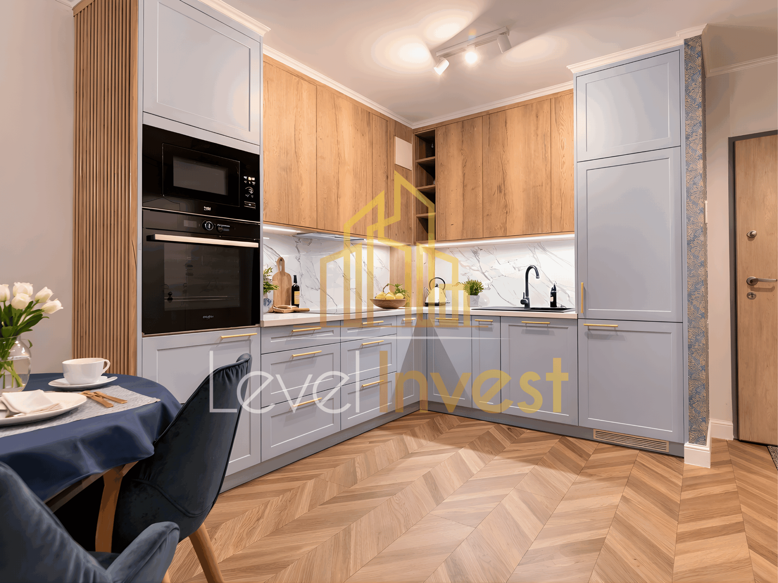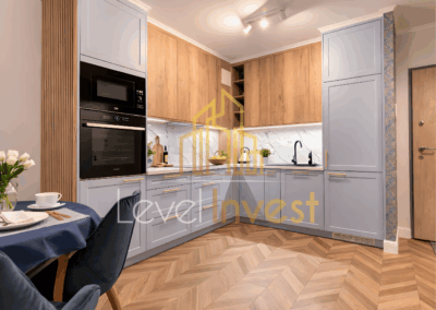 - Kitchen – modern built-in furniture, high-quality appliances (induction hob, oven, dishwasher, microwave), fully equipped