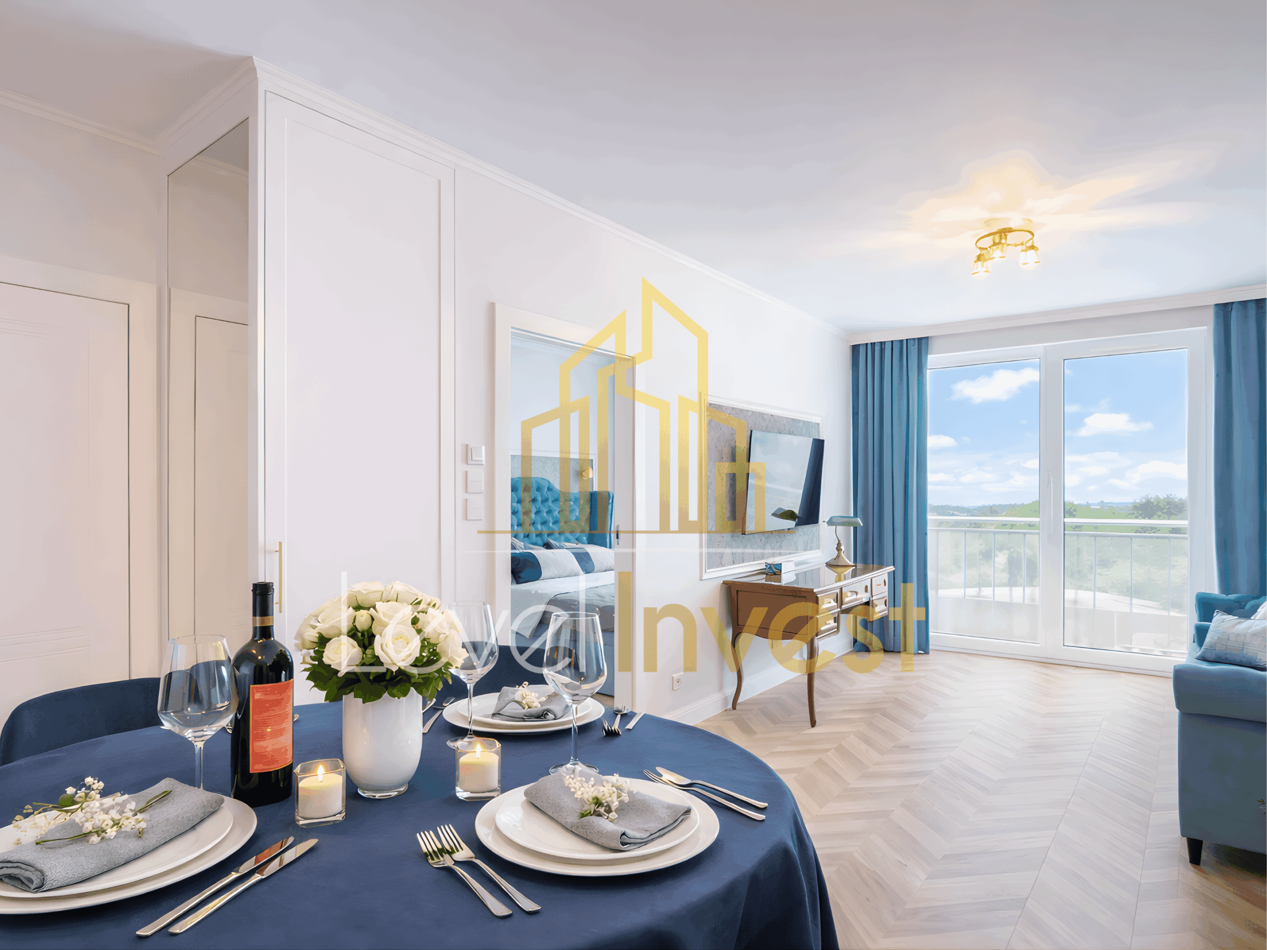 The interior is designed in a modern, elegant style inspired by boutique hotel apartments. Bright colors, herringbone wooden flooring, and subtle gold accents create a cohesive and luxurious atmosphere.
