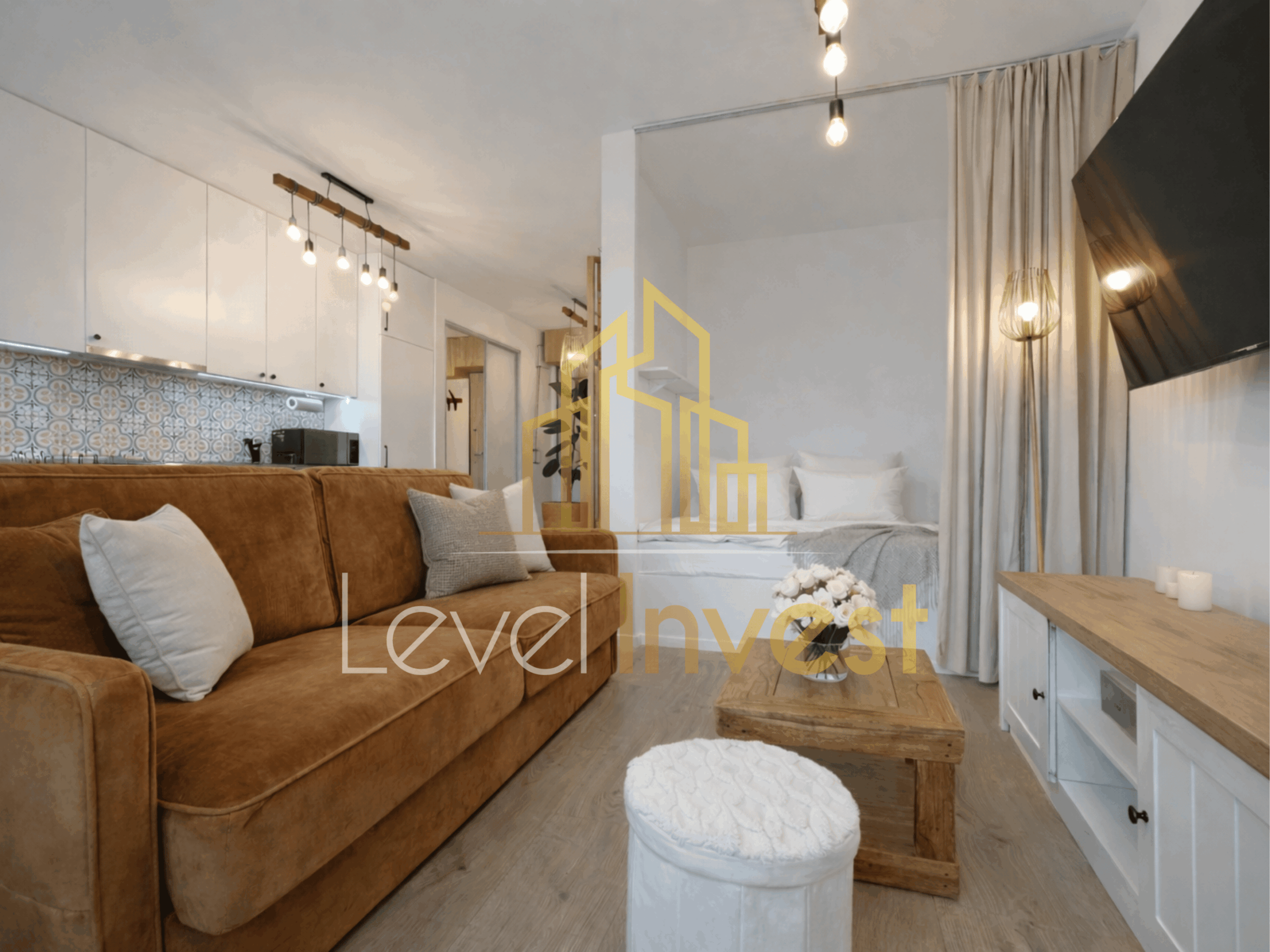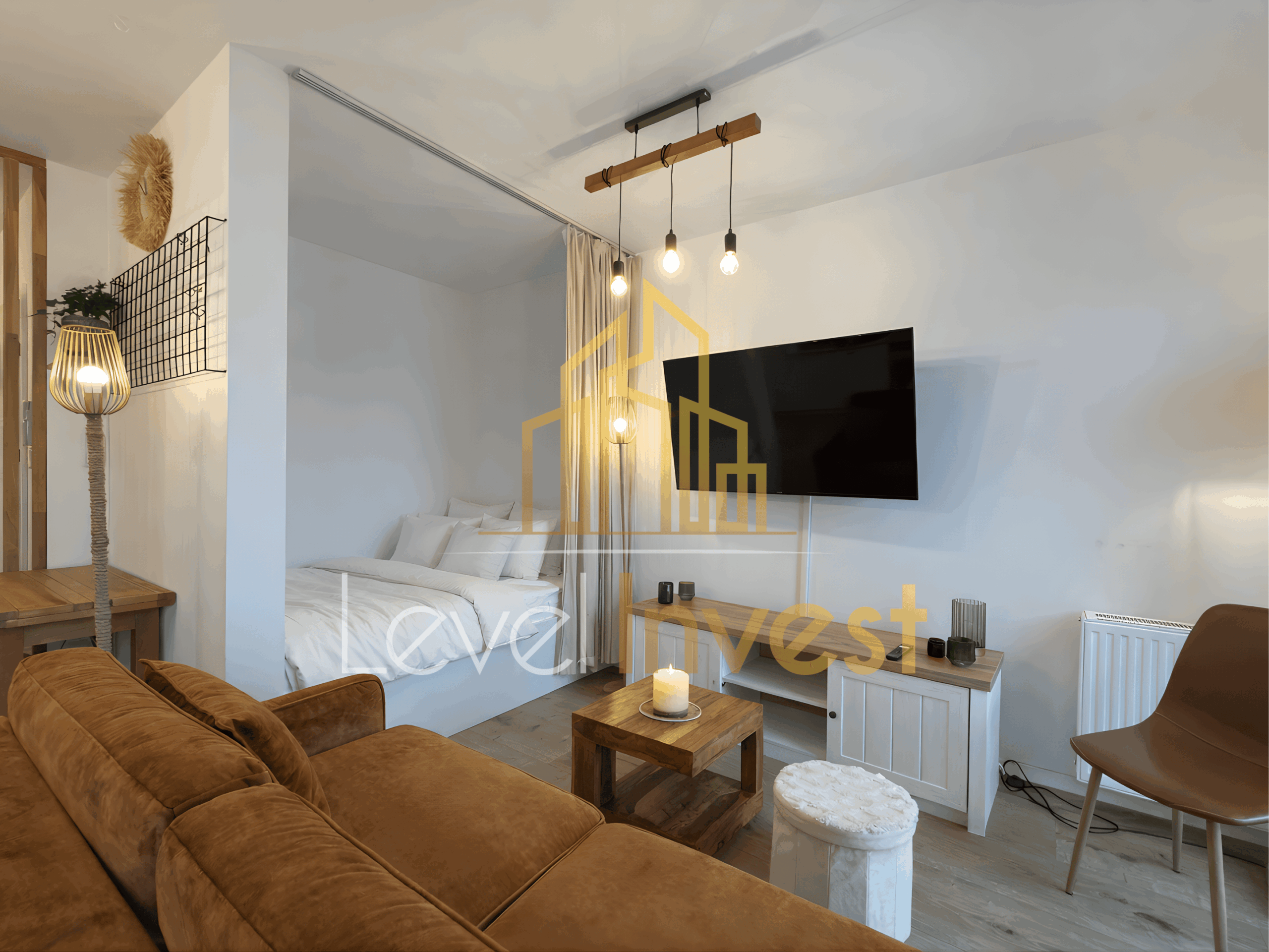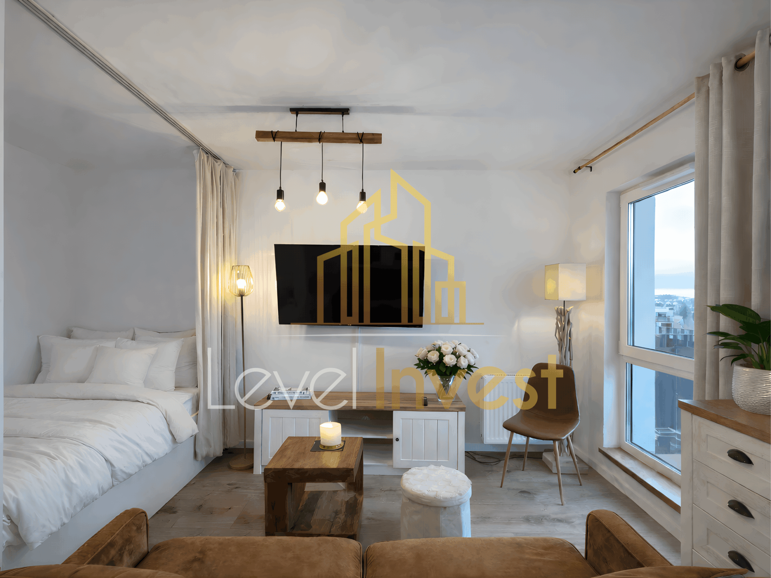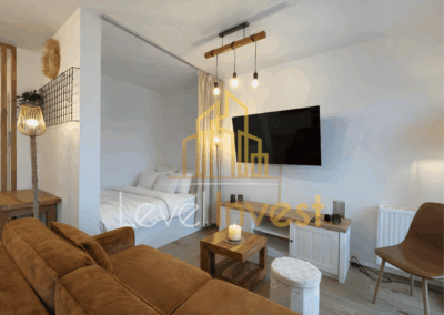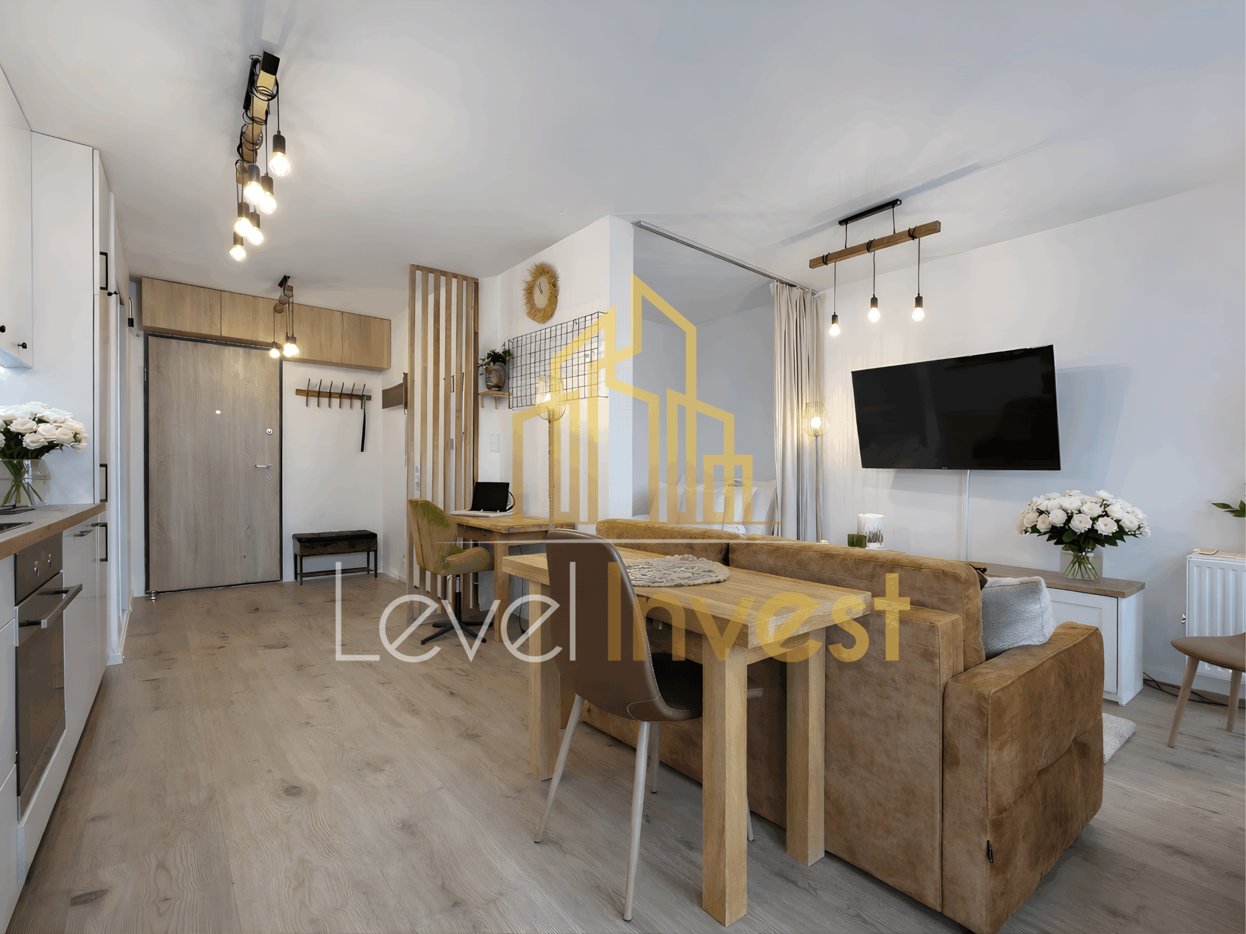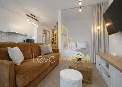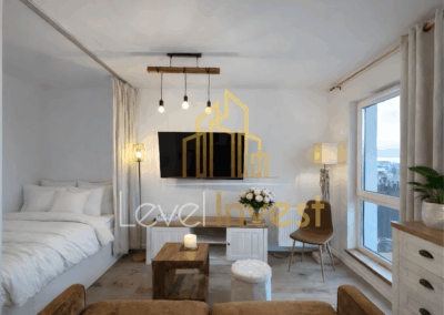 For rent: an elegant studio apartment with a separate bedroom area, located in a modern, high-standard apartment building. This is an ideal option for those seeking a comfortable rental property that combines aesthetics, functionality, and full equipment. The apartment was designed by an interior architect in a Scandinavian style. Bright colors, natural wood, black accents, and carefully designed lighting create a space that is both modern and cozy. The entire interior has been finished to a high standard, with great attention to detail and everyday comfort.