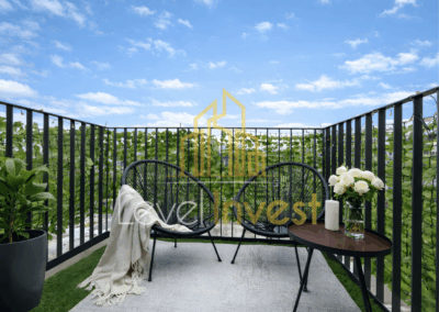 Duży balkon stanowi dodatkową przestrzeń użytkową – idealną do relaksu, pracy zdalnej lub spędzania wolnego czasu.