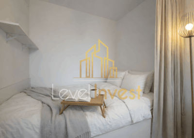Pełnowymiarowe łóżko oraz przemyślana aranżacja sprawiają, że mieszkanie funkcjonuje jak komfortowe studio z oddzielną sypialnią, a nie klasyczna kawalerka.