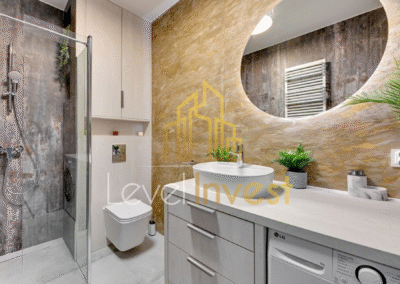 - Designerska łazienka z kabiną prysznicową, pralką i umywalką z praktyczną zabudową
