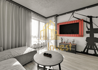 - Przestronny, jasny salon z rozkładaną sofą, eleganckim stolikiem kawowym oraz telewizorem LCD 40″