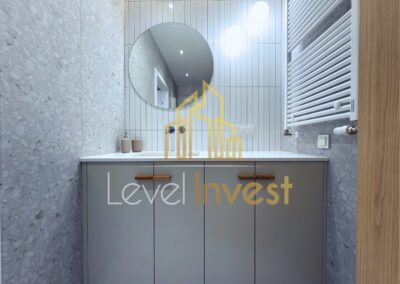 Dodatkowo zastosowano wysokiej klasy materiały wykończeniowe, elegancką armaturę i spójne dodatki, tworząc luksusową aranżację wnętrza.