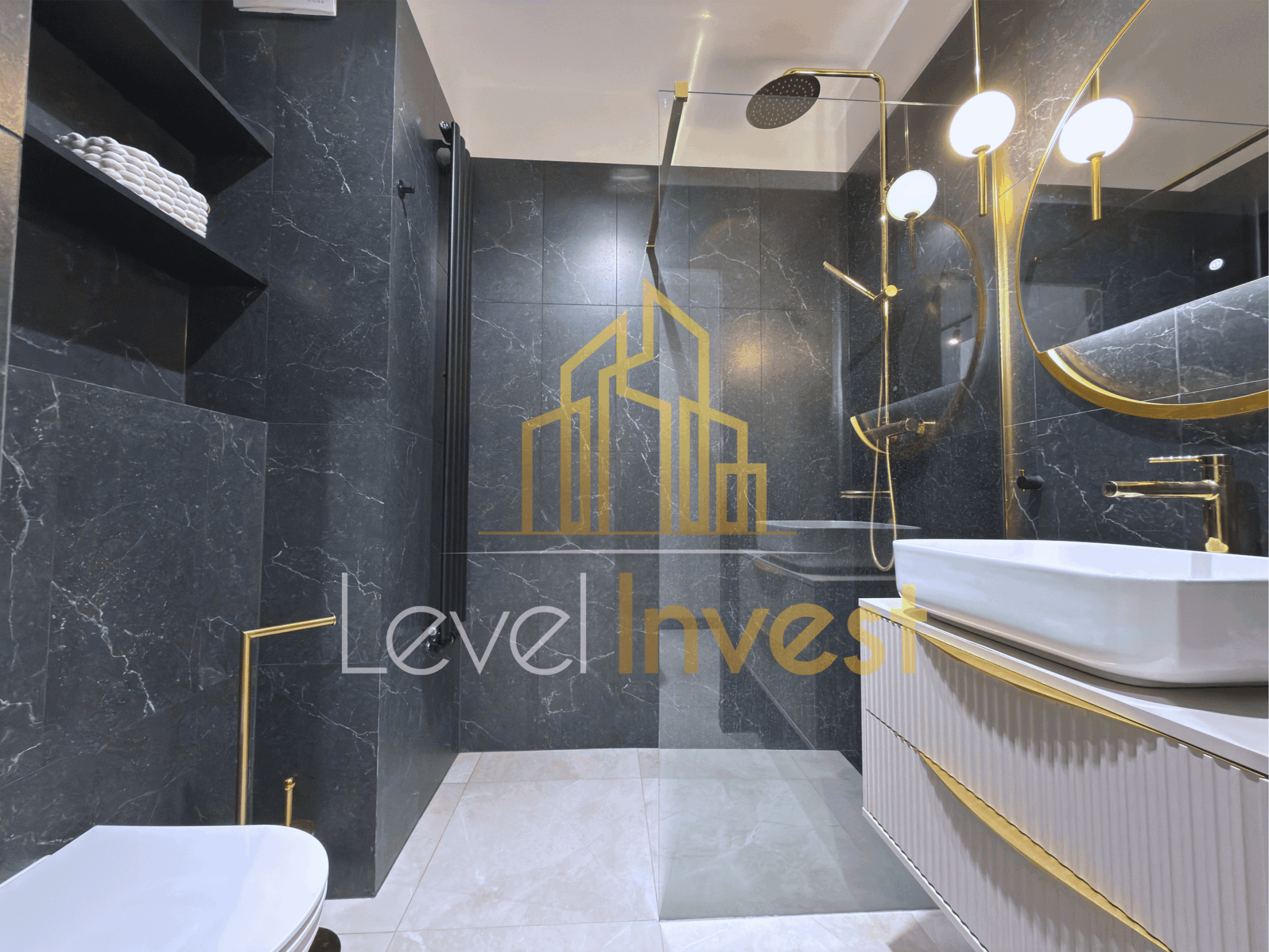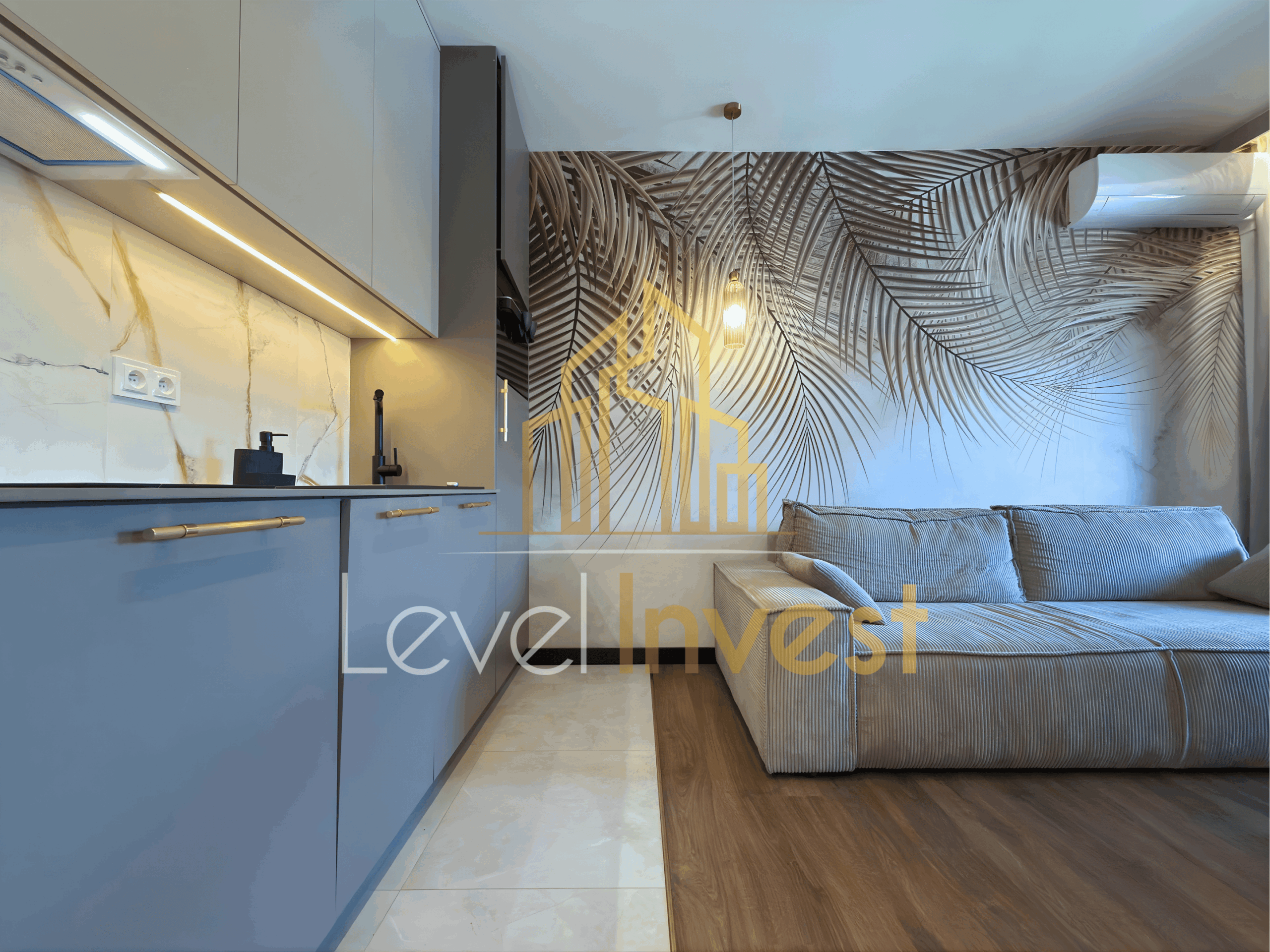 The apartment features a spacious living room with an open-plan kitchen and access to a large loggia, providing natural light and a comfortable outdoor space. The bedroom is designed for maximum comfort and relaxation. The bathroom includes a premium shower and fixtures, completing the luxurious feel of the apartment.