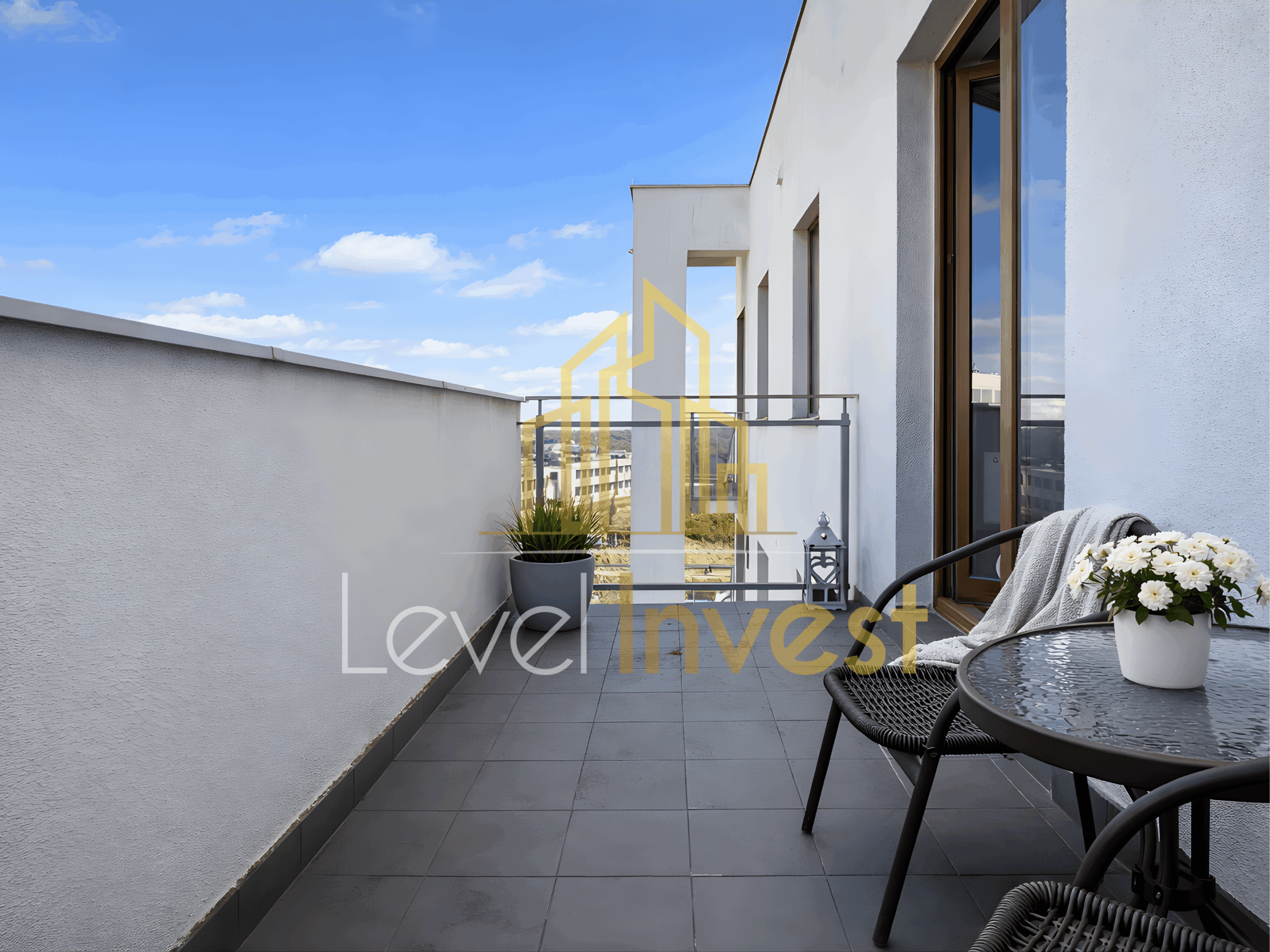 Duży balkon na całą długość mieszkania zapewnia dodatkową przestrzeń do odpoczynku.