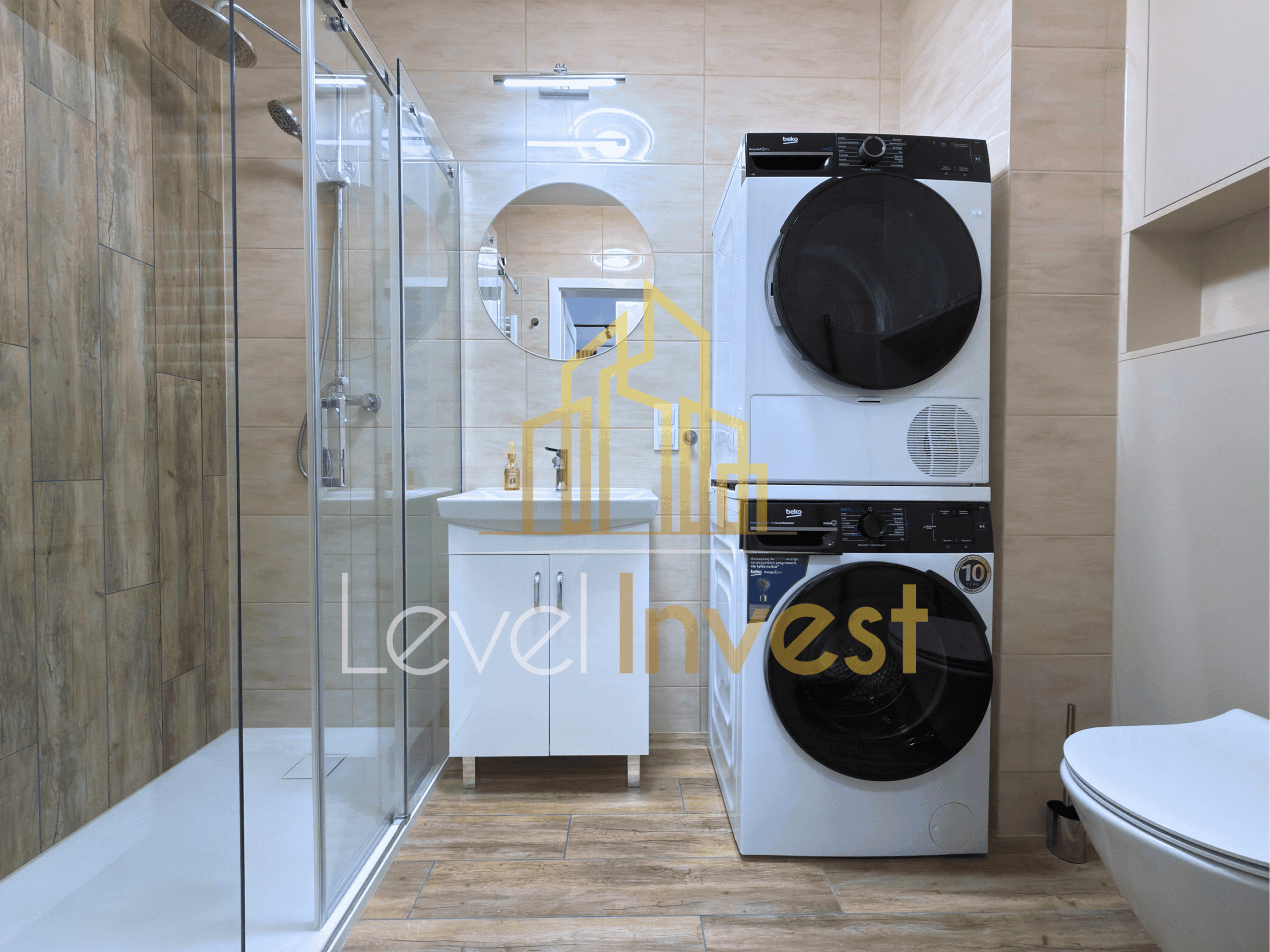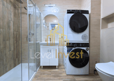 - Bathroom – modern, with a shower cabin, washing machine, dryer, and practical storage cabinets for convenience and functionality.
