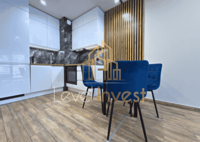 - Living room with a kitchenette – spacious and modern, fully equipped with high-quality appliances: refrigerator, two-burner induction cooktop, oven, and dishwasher. The living area includes a corner sofa, TV, coffee tables, and a dining table with chairs, providing a comfortable space for meals and gatherings with family or friends.