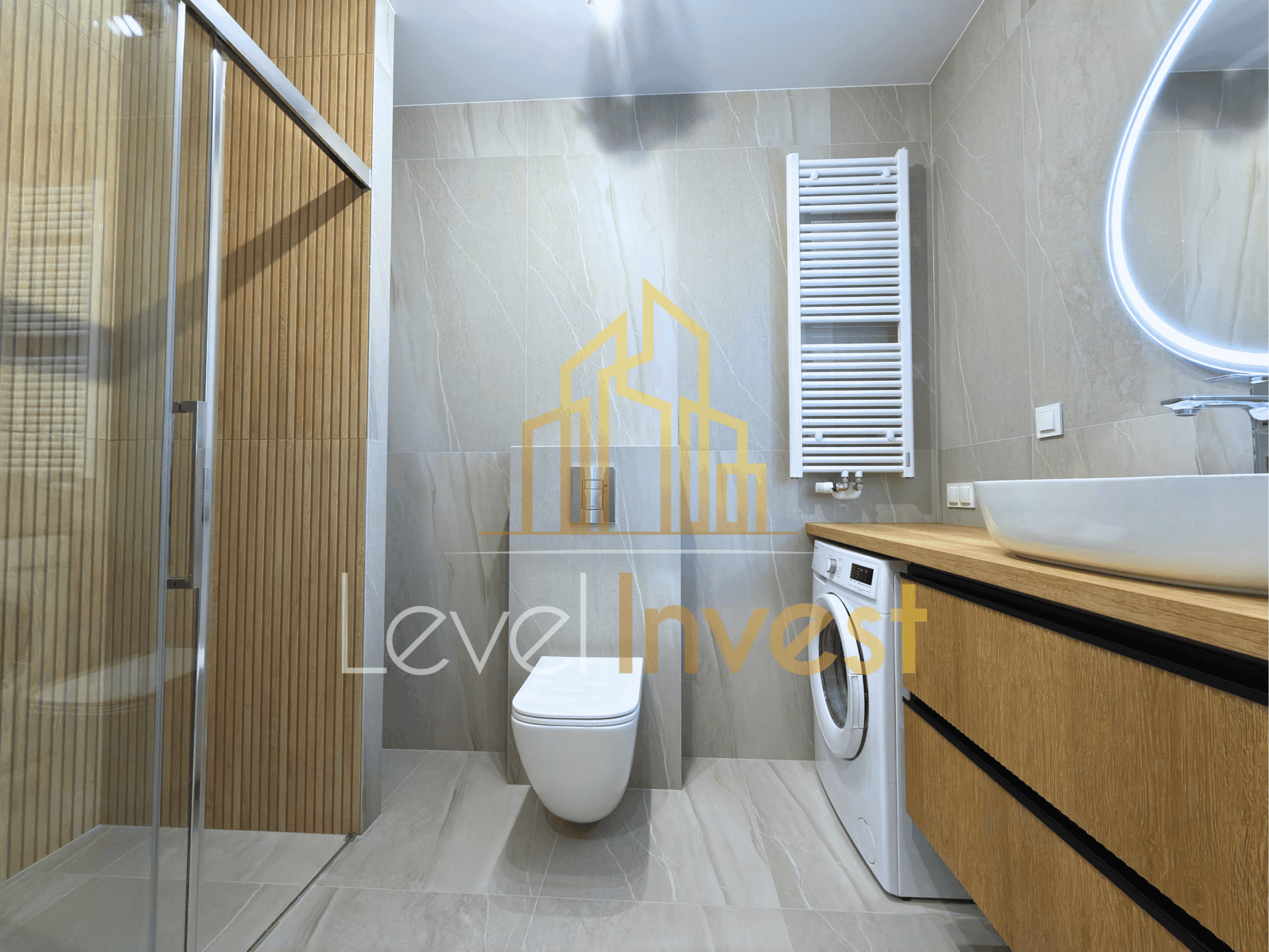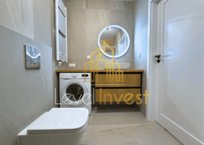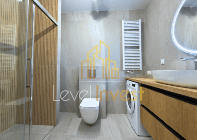 - Łazienka: duży prysznic, pralka, pojemne szafki, lustro – wszystko w nowoczesnym, eleganckim stylu