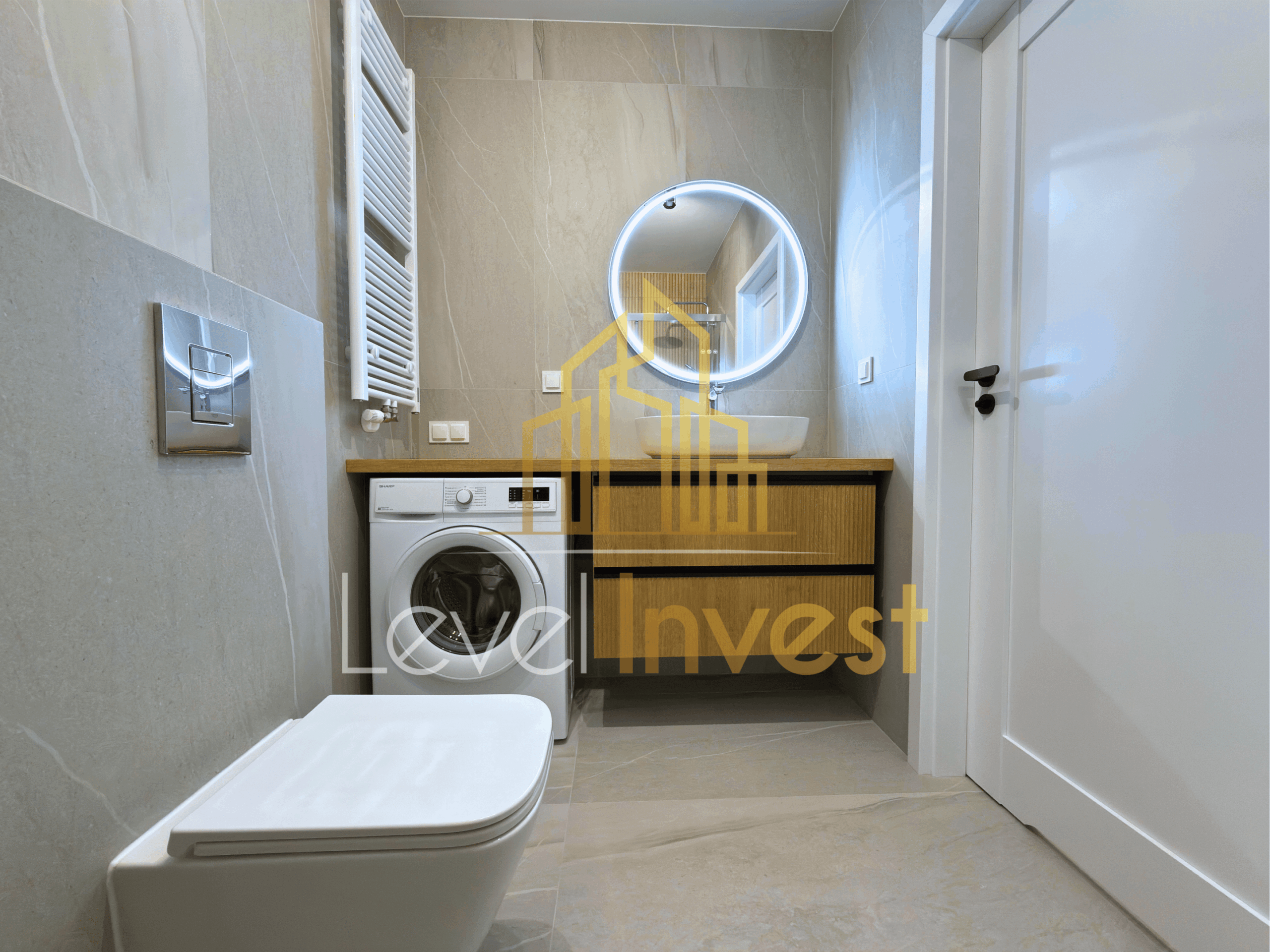 - Bathroom: large shower, washing machine, storage cabinets, mirror – all in a modern, elegant style