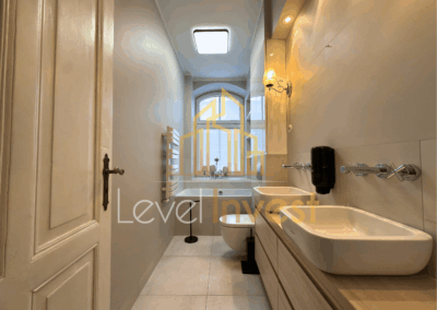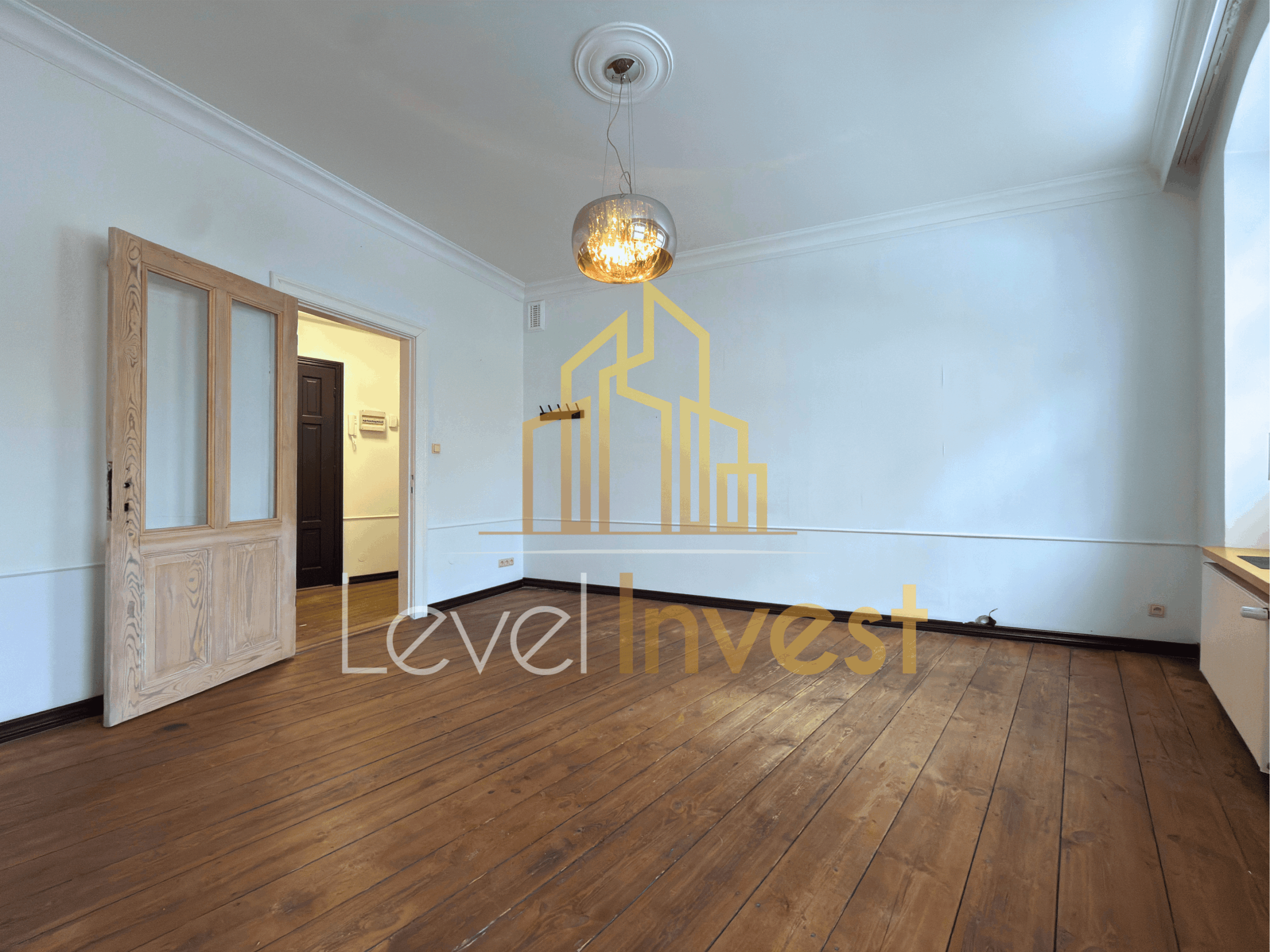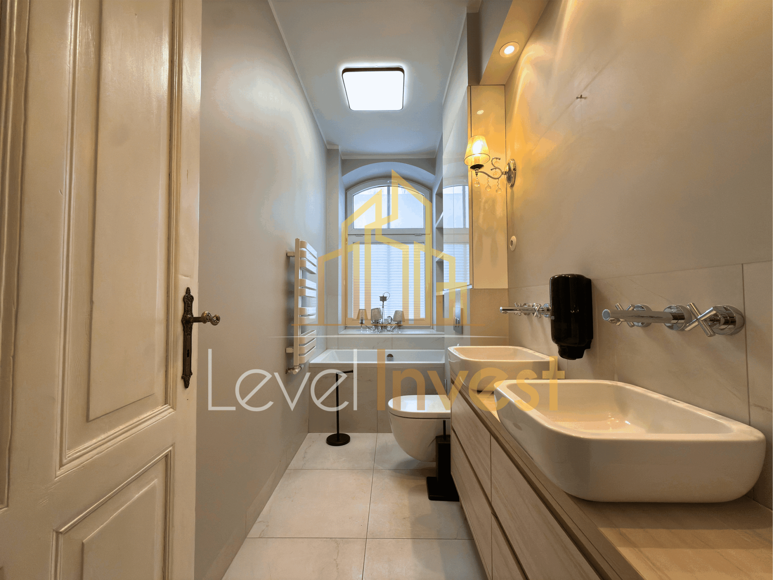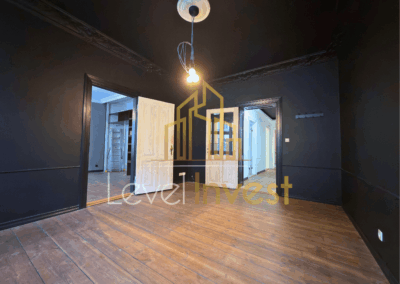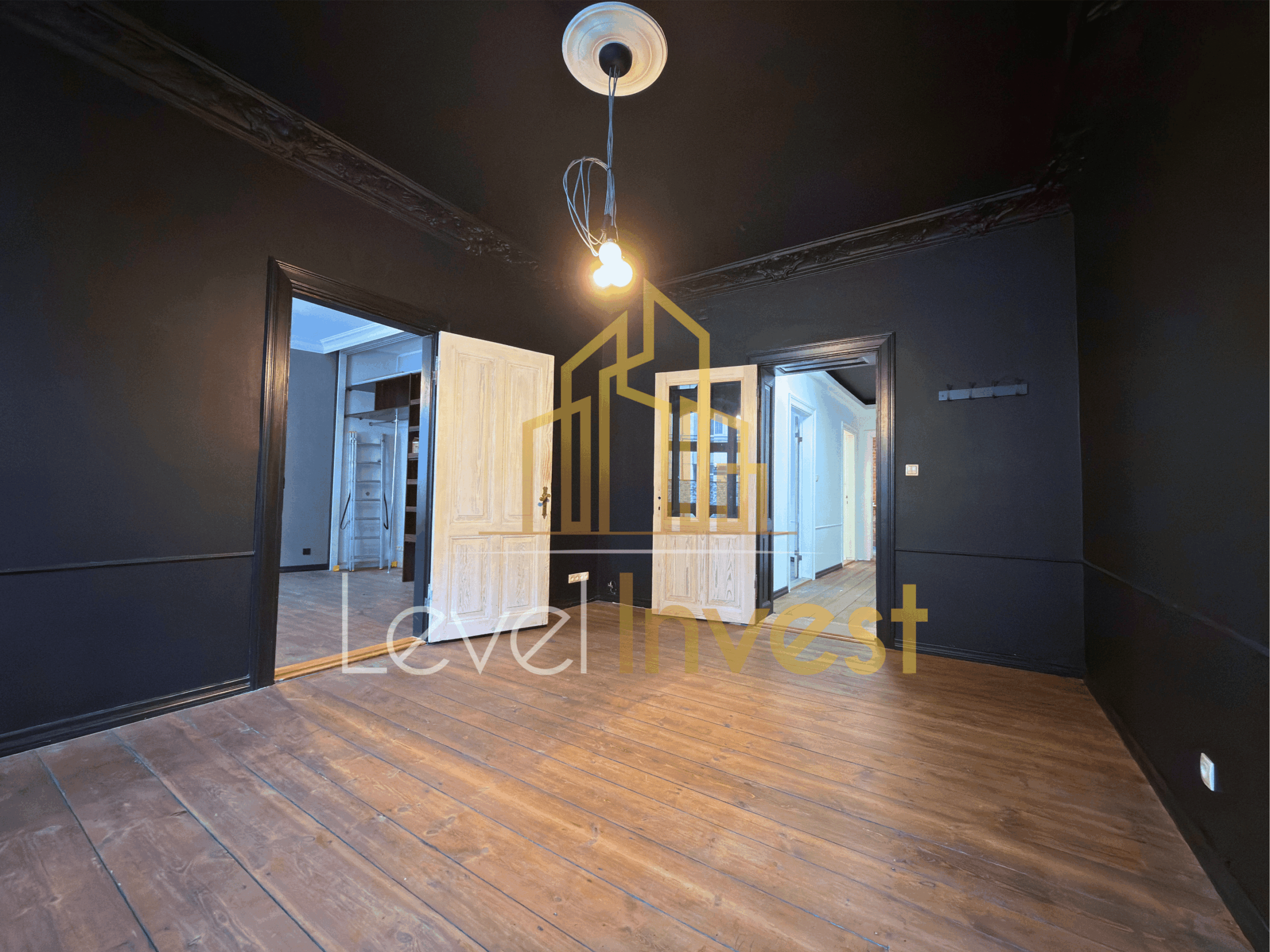 The interiors combine contemporary design with classic details – wooden floors, decorative moldings, and original interior doors give the apartment a unique character.