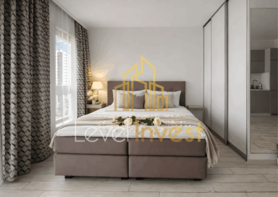 - Living area with sleeping zone – comfortable 160×200 bed, spacious wardrobe, table with chairs, TV