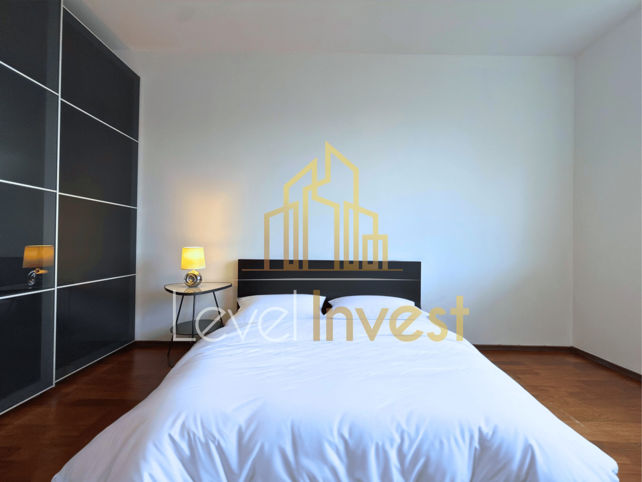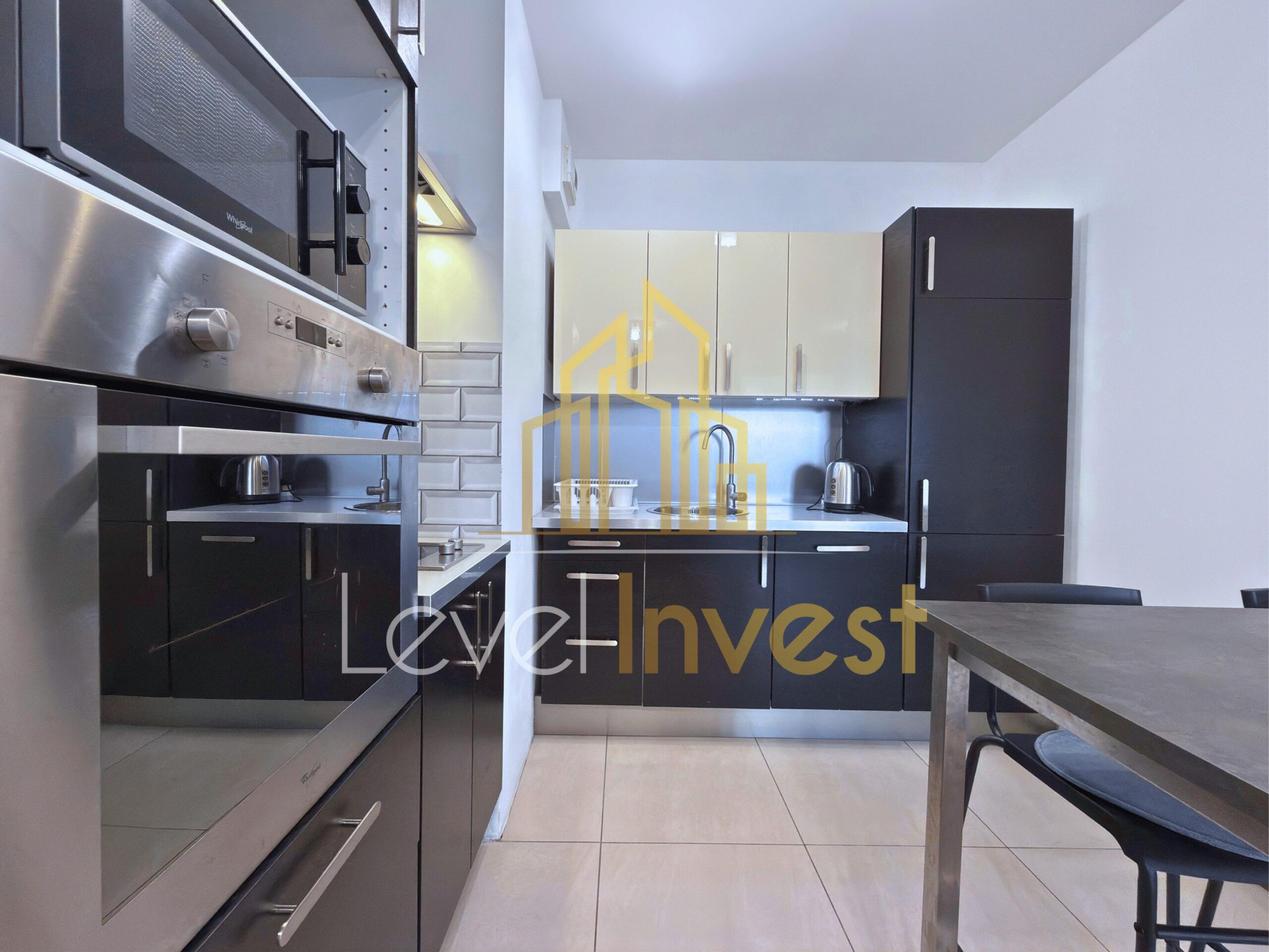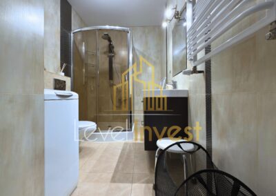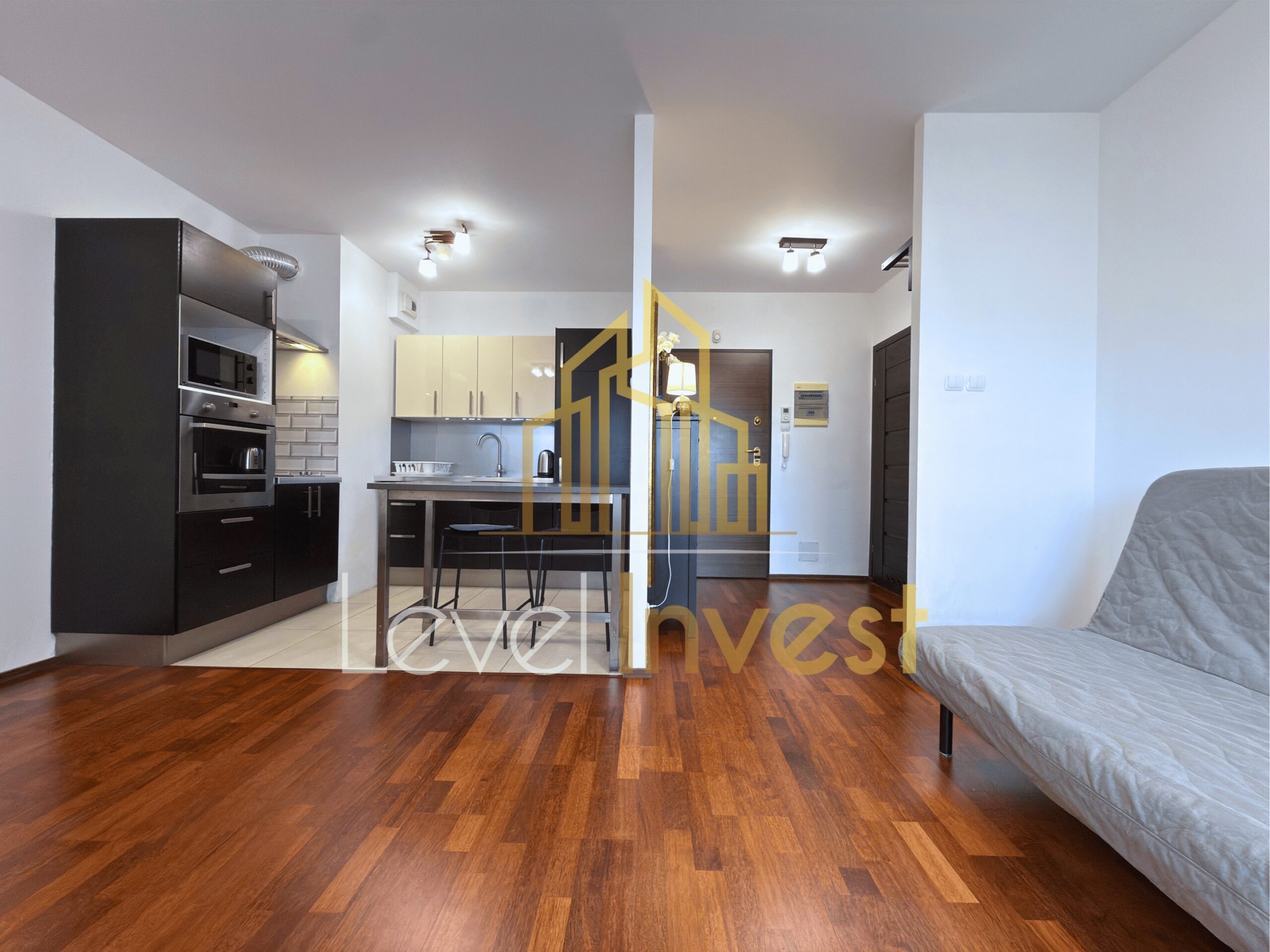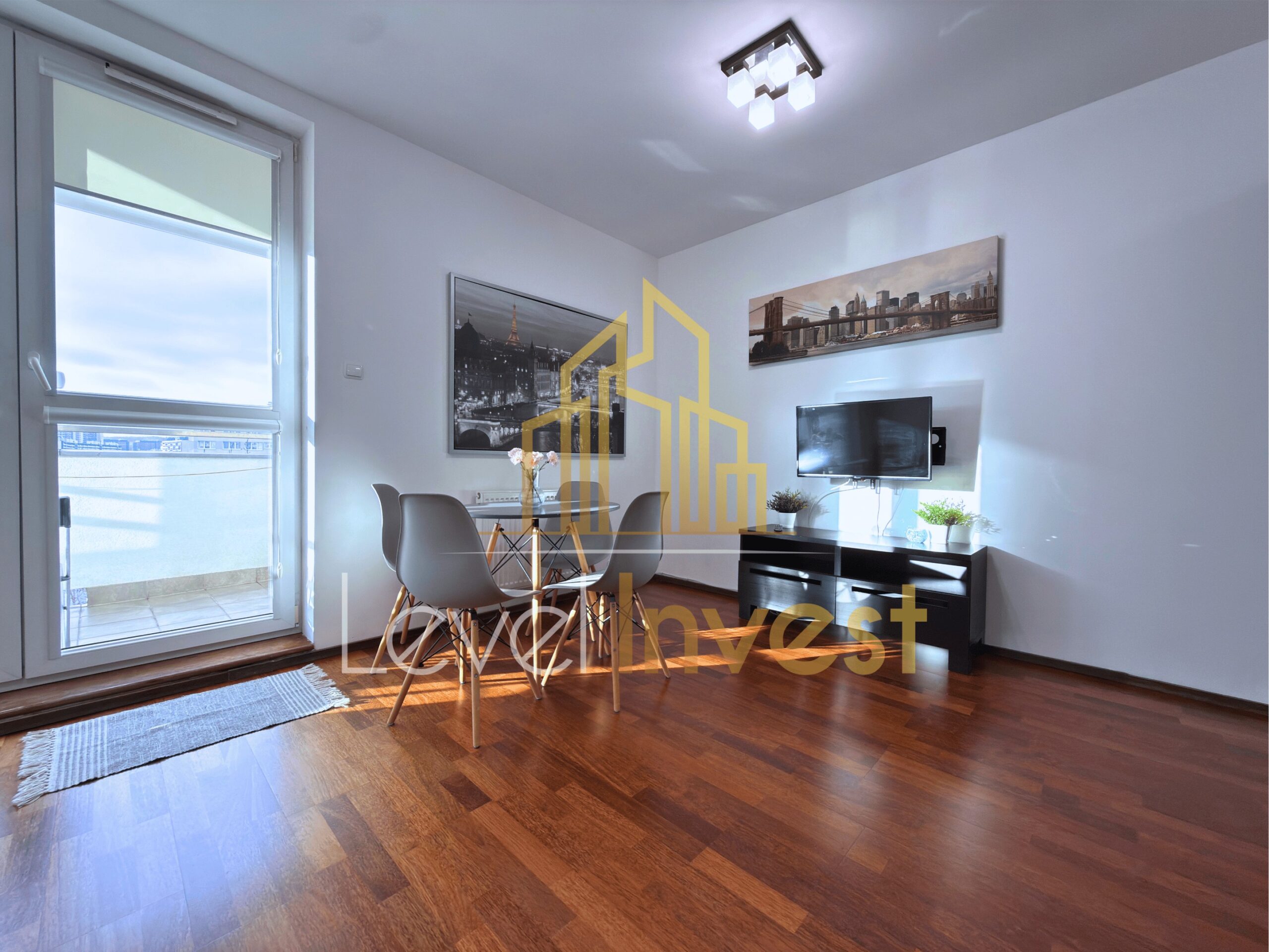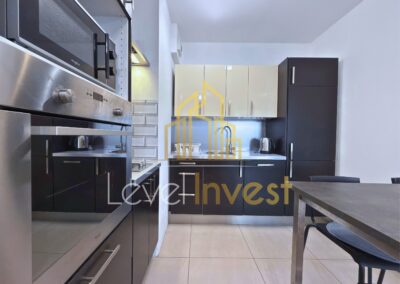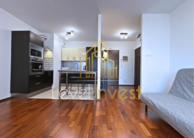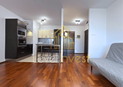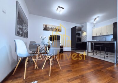 The apartment consists of a spacious living room with a kitchenette, a bedroom, a bathroom, and a balcony, perfect for morning coffee, evening relaxation, or social gatherings. The kitchen is fully equipped – induction hob, oven/microwave, dishwasher, and a large fridge, with plenty of countertop space for meal preparation. The living room features a sofa bed, coffee table, and TV cabinet, creating a cozy space for relaxation or remote work. The bedroom offers a comfortable bed, spacious wardrobe, and elegant furniture, ensuring comfort and privacy. Additionally, the apartment includes a washing machine, dining table with 4 chairs, and modern LED lighting, making daily life practical and convenient. The bright color scheme, large windows, and modern finishing add elegance and make the apartment feel even more spacious.