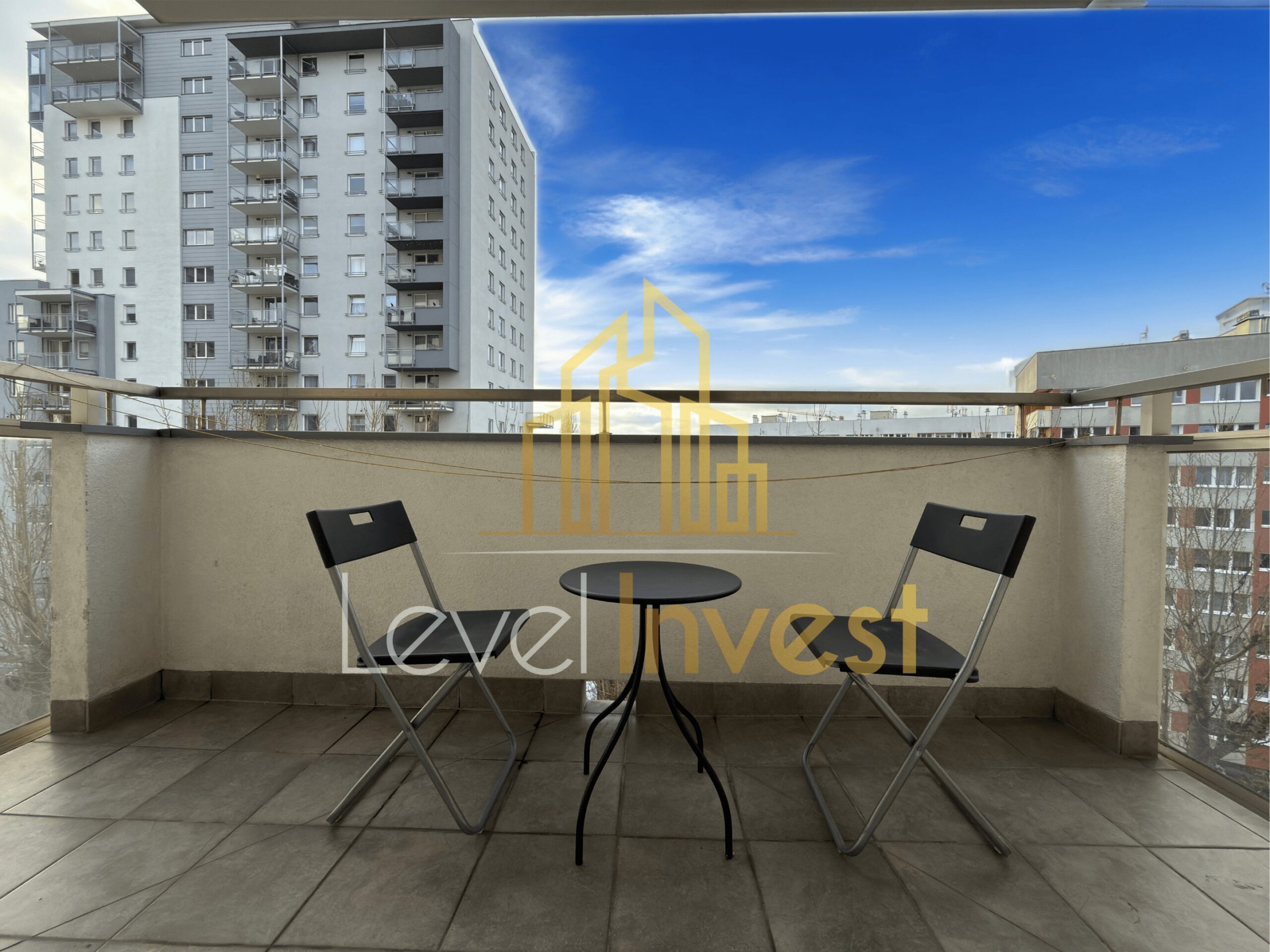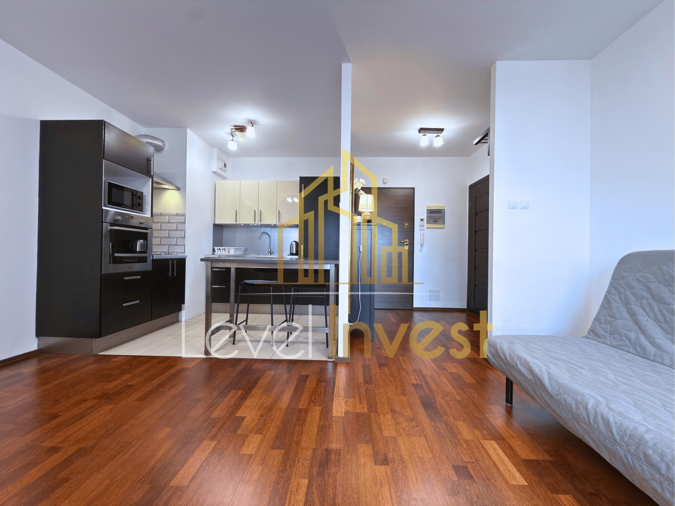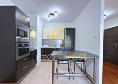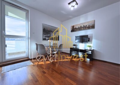 Mieszkanie składa się z przestronnego salonu z aneksem kuchennym, sypialni, łazienki oraz balkonu, który jest idealny na poranną kawę, wieczorny relaks lub spotkania ze znajomymi. Kuchnia w pełni wyposażona – płyta indukcyjna, piekarnik/mikrofalówka, zmywarka, duża lodówka, a blat roboczy zapewnia wygodę podczas przygotowywania posiłków. W salonie znajduje się rozkładana sofa, stolik kawowy i szafka RTV, co tworzy przytulną przestrzeń do odpoczynku lub pracy zdalnej. Sypialnia oferuje wygodne łóżko, pojemną szafę oraz eleganckie meble, zapewniając komfort i prywatność. Dodatkowo mieszkanie wyposażone jest w pralkę, stół z 4 krzesłami oraz nowoczesne oświetlenie LED, co sprawia, że codzienne życie staje się wygodne i praktyczne. Jasna kolorystyka wnętrz, duże przeszklenia oraz nowoczesne wykończenie nadają przestrzeni elegancji i sprawiają, że mieszkanie wydaje się jeszcze bardziej przestronne.