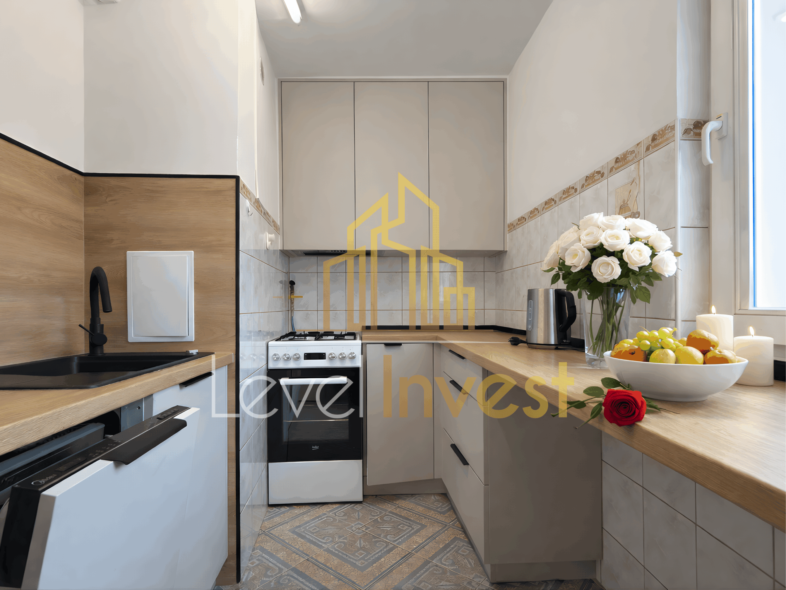 – Separate, modern kitchen with appliances (refrigerator, dishwasher)